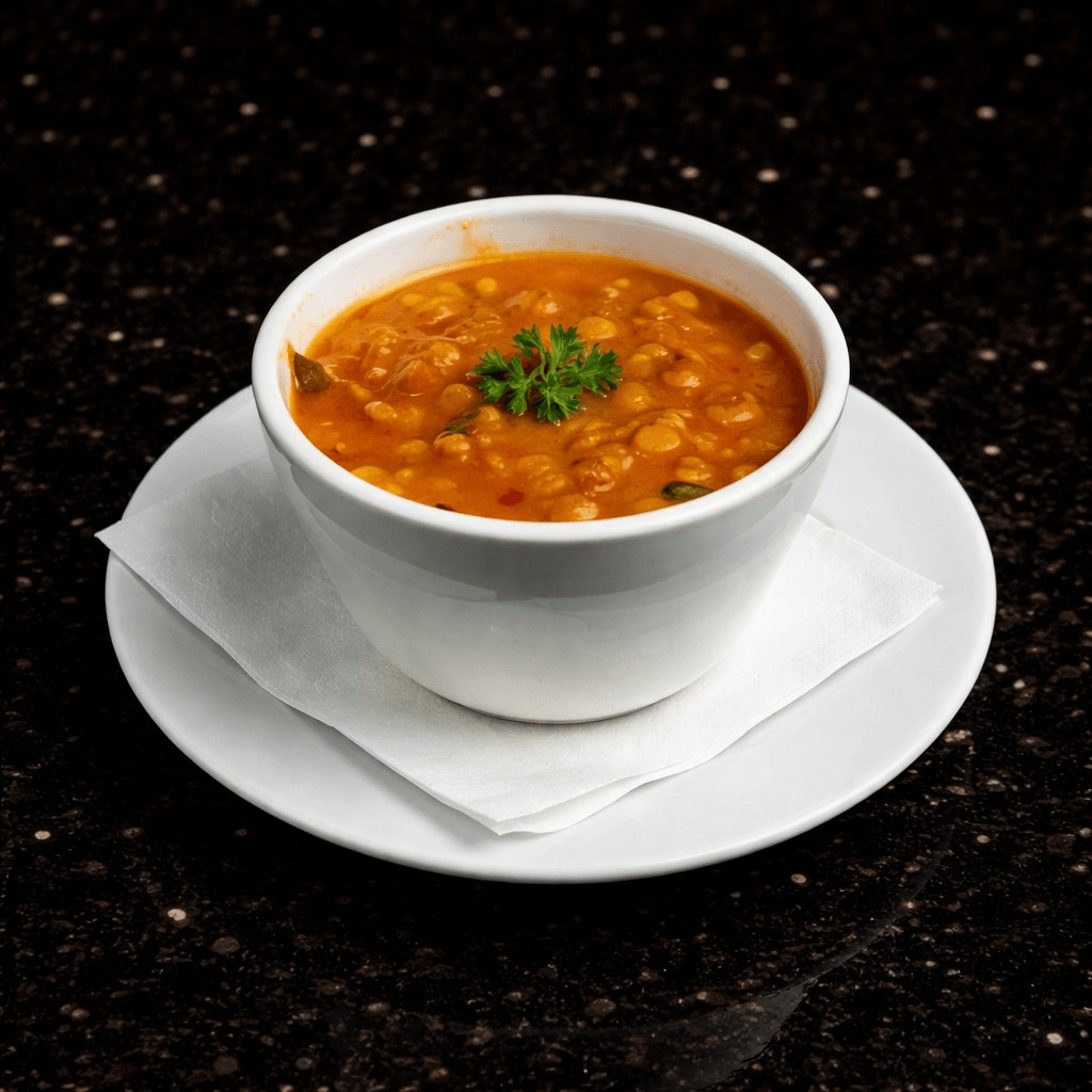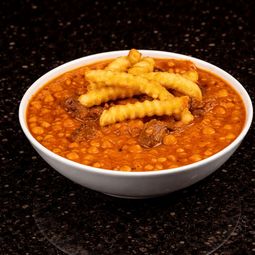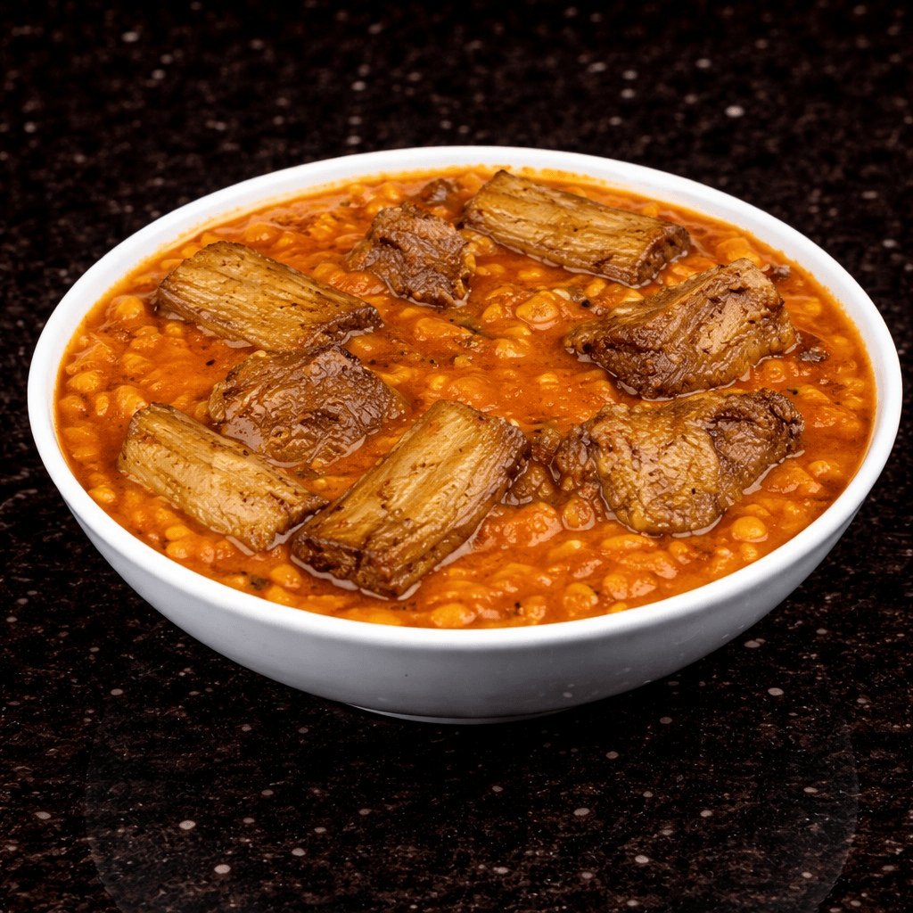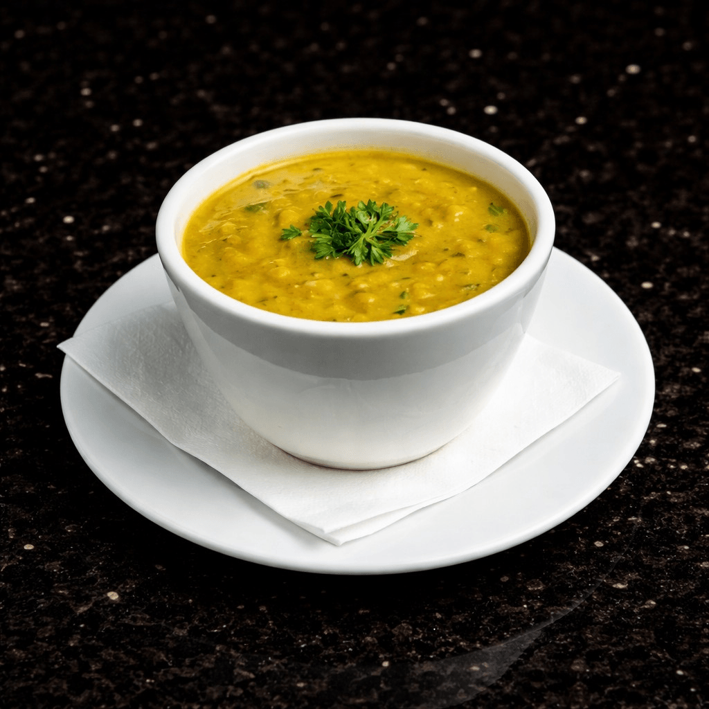 Comforting & hearty stew: yellow split peas simmered in aromatic saffron tomato sauce - topped with tangy sun-dried lime