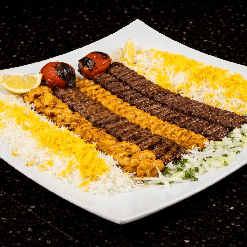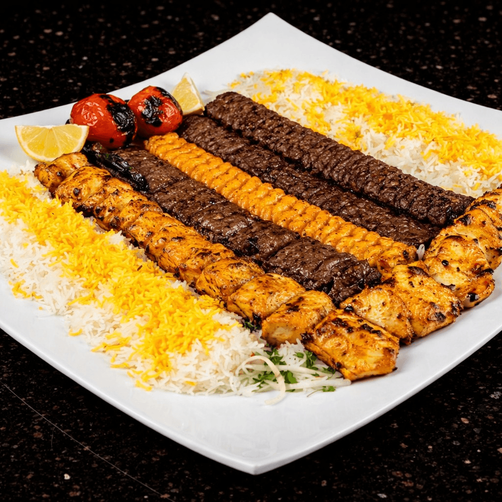 Feast with (2) skewers of beef koobideh, (1) chicken koobideh, (1) chicken breast kabob, and (1) beef barg, served with (2) portions of fluffy basmati rice. serves 2-3 people