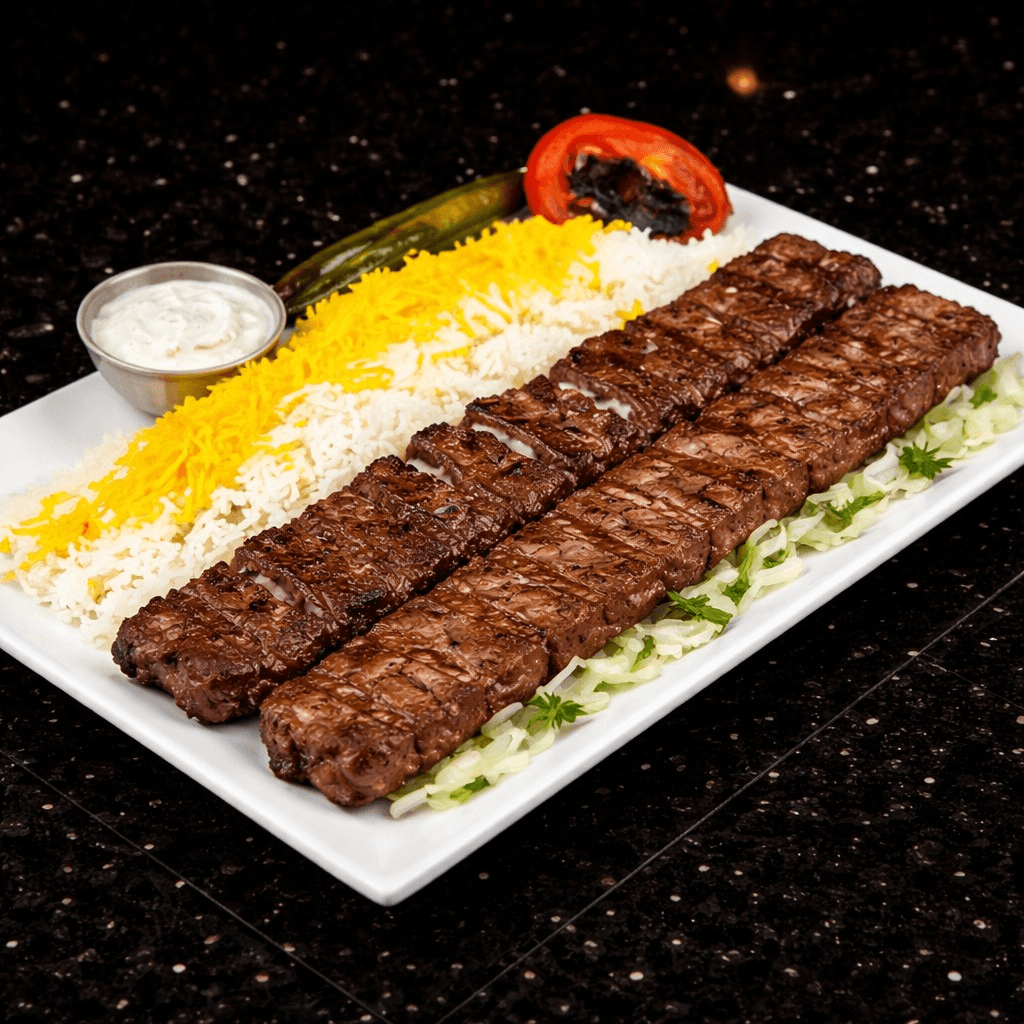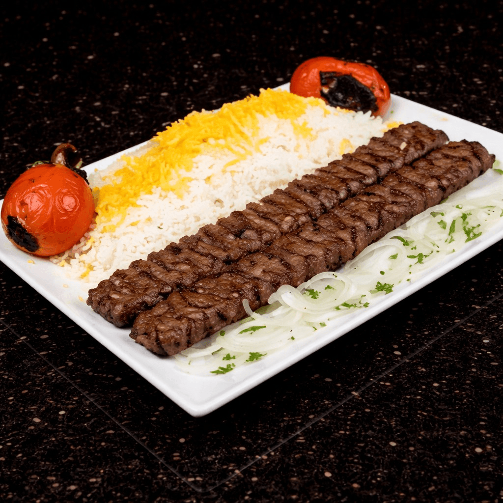Two skewers of premium ground beef blended with fresh onions and persian spices, grilled on open flames
