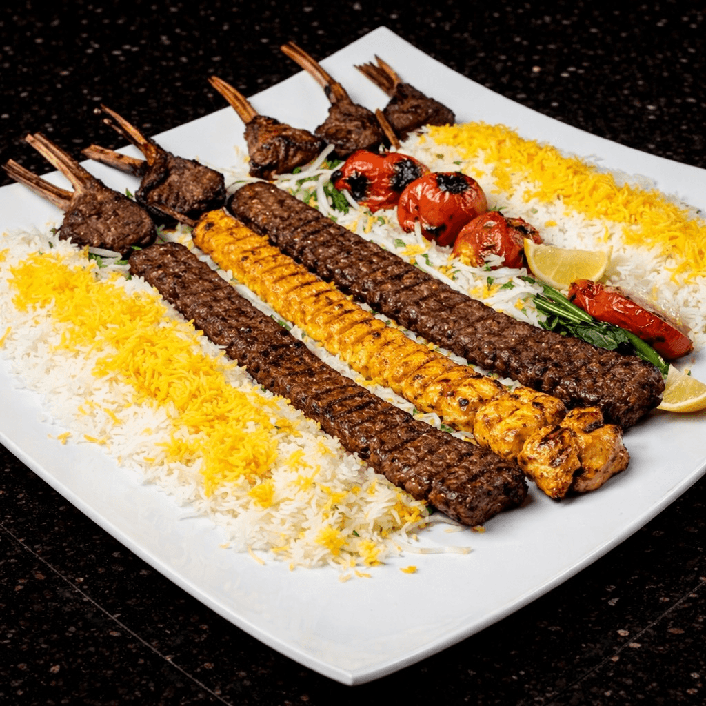 The ultimate experience: beef koobideh, chicken koobideh, chicken breast, tender beef barg, and three lamb chops, served with basmati rice. serves 4-5 people