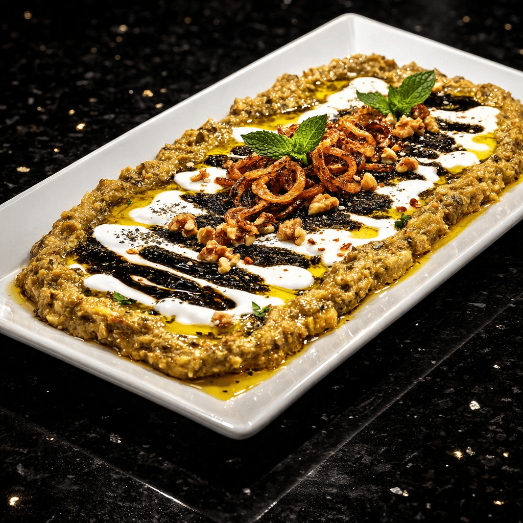 Roasted eggplant cooked with sautéed onions, garlic, and mint, topped with whey and caramelized onions